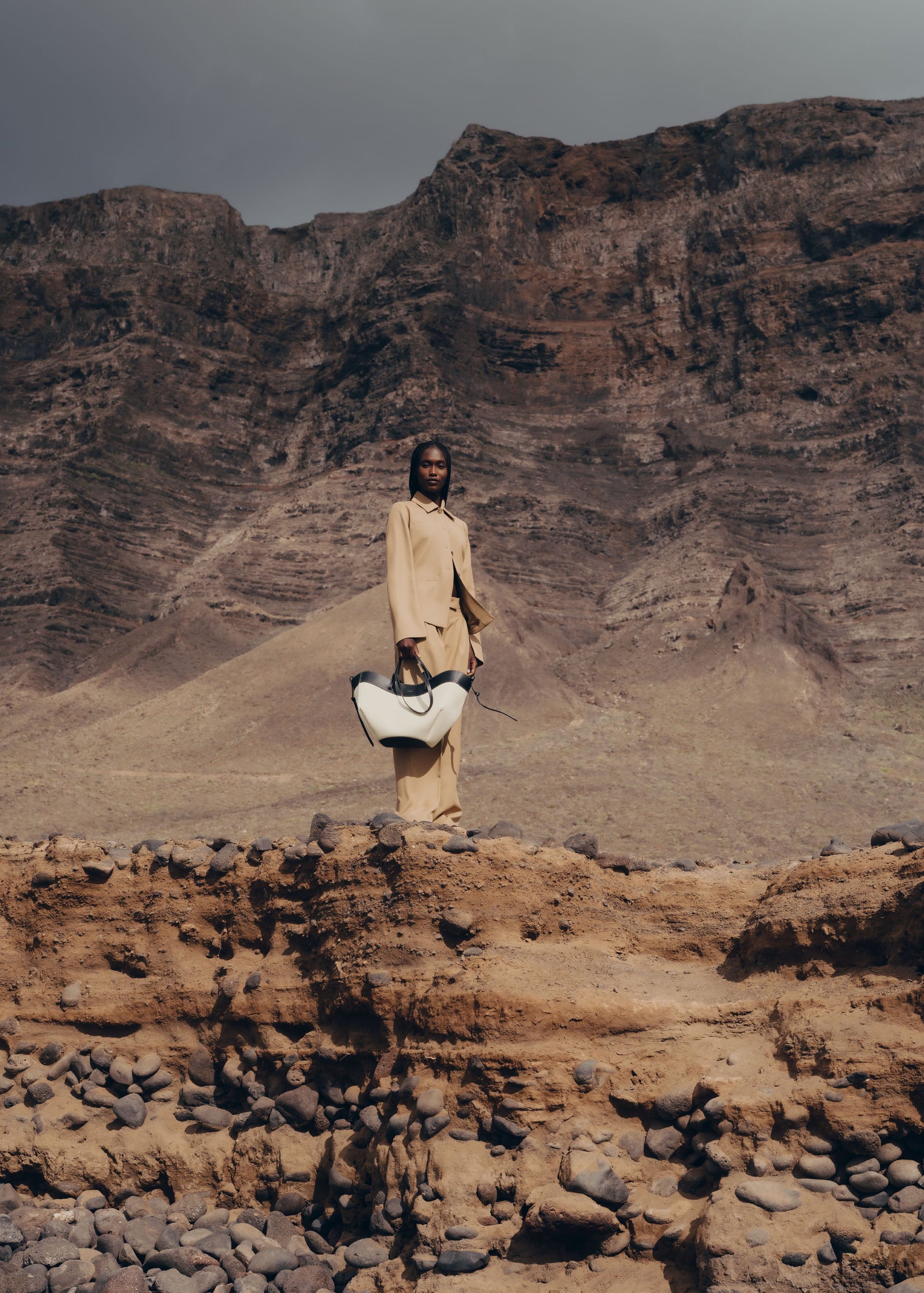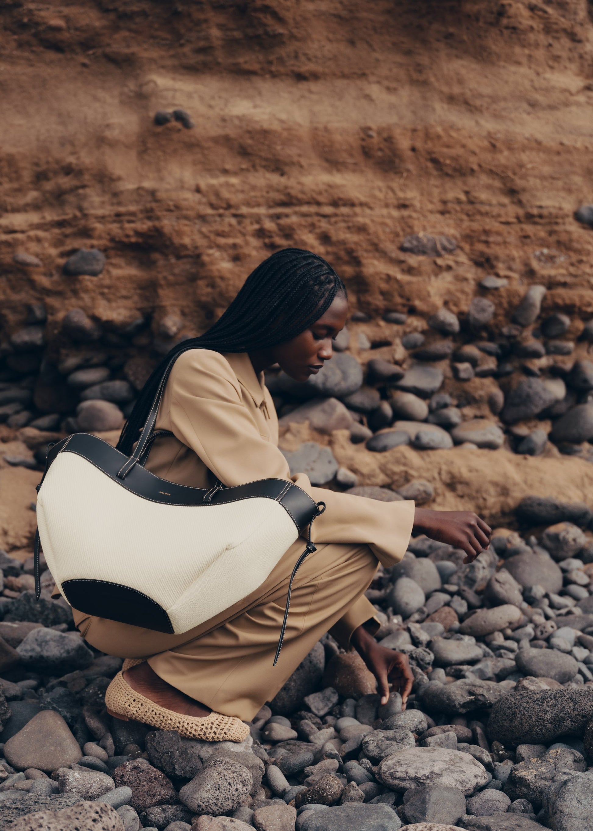This sculptured tote bag featuring waves, folds, and curves can be used in two ways. The first is a basket, its sides open, its straps on the outside. The second is a floral, closed bag, its sides tucked in, its straps crossing on the inside. Its name was inspired by the French word “cime”, meaning a peak or mountain crest, in reference to the ridge running along it.
