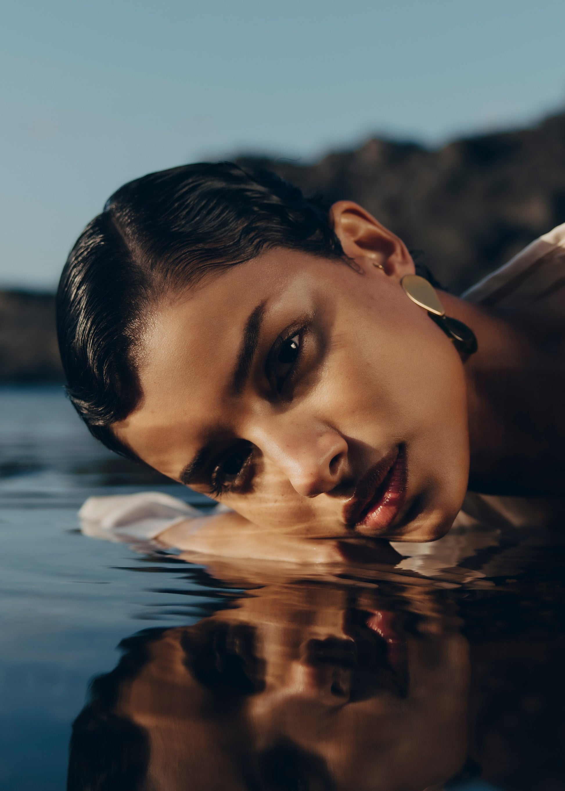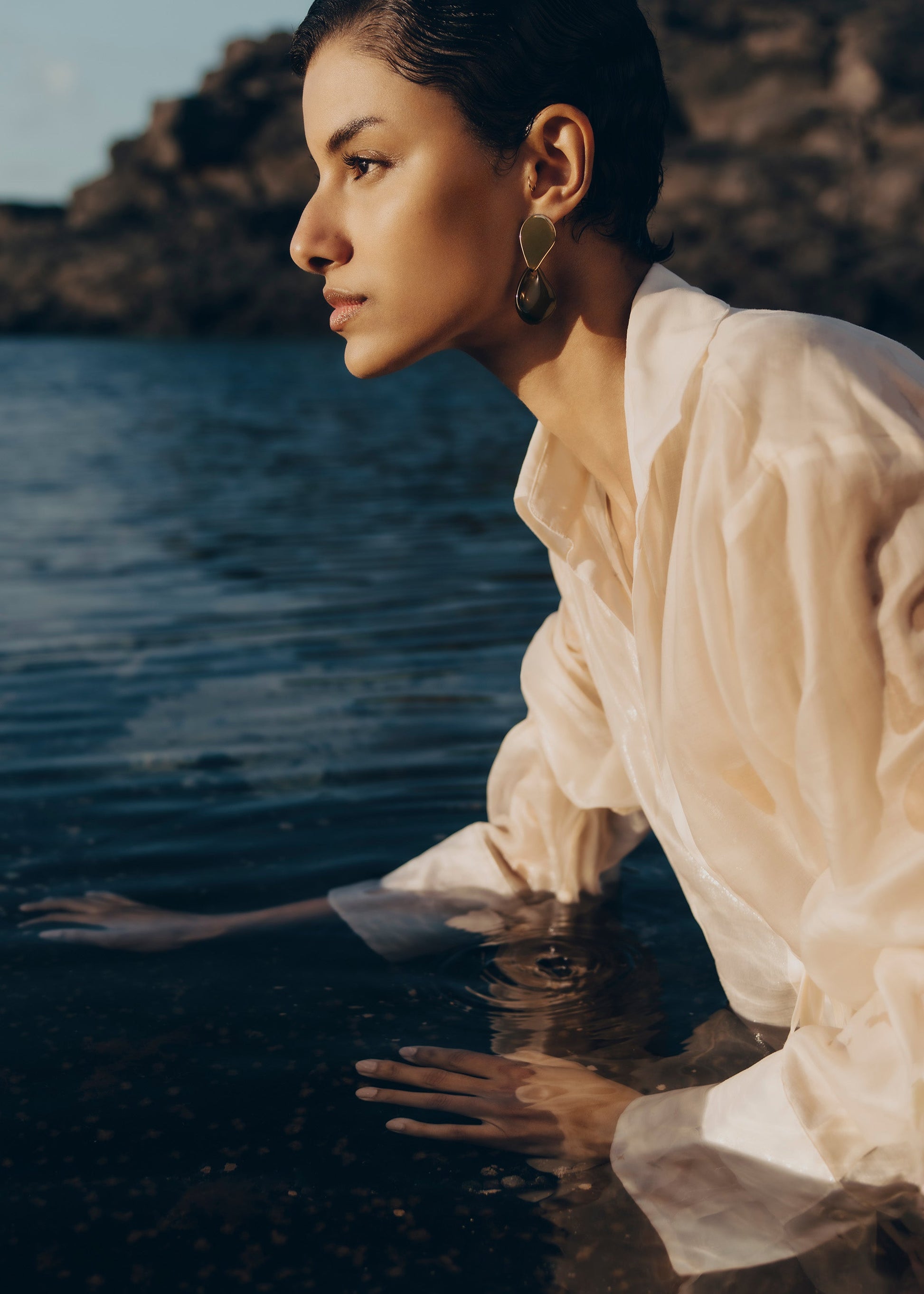 The elegance of two suspended droplets—one gold-plated and the other sculpted in glass. The name “Naé” is a nod to water nymphs.