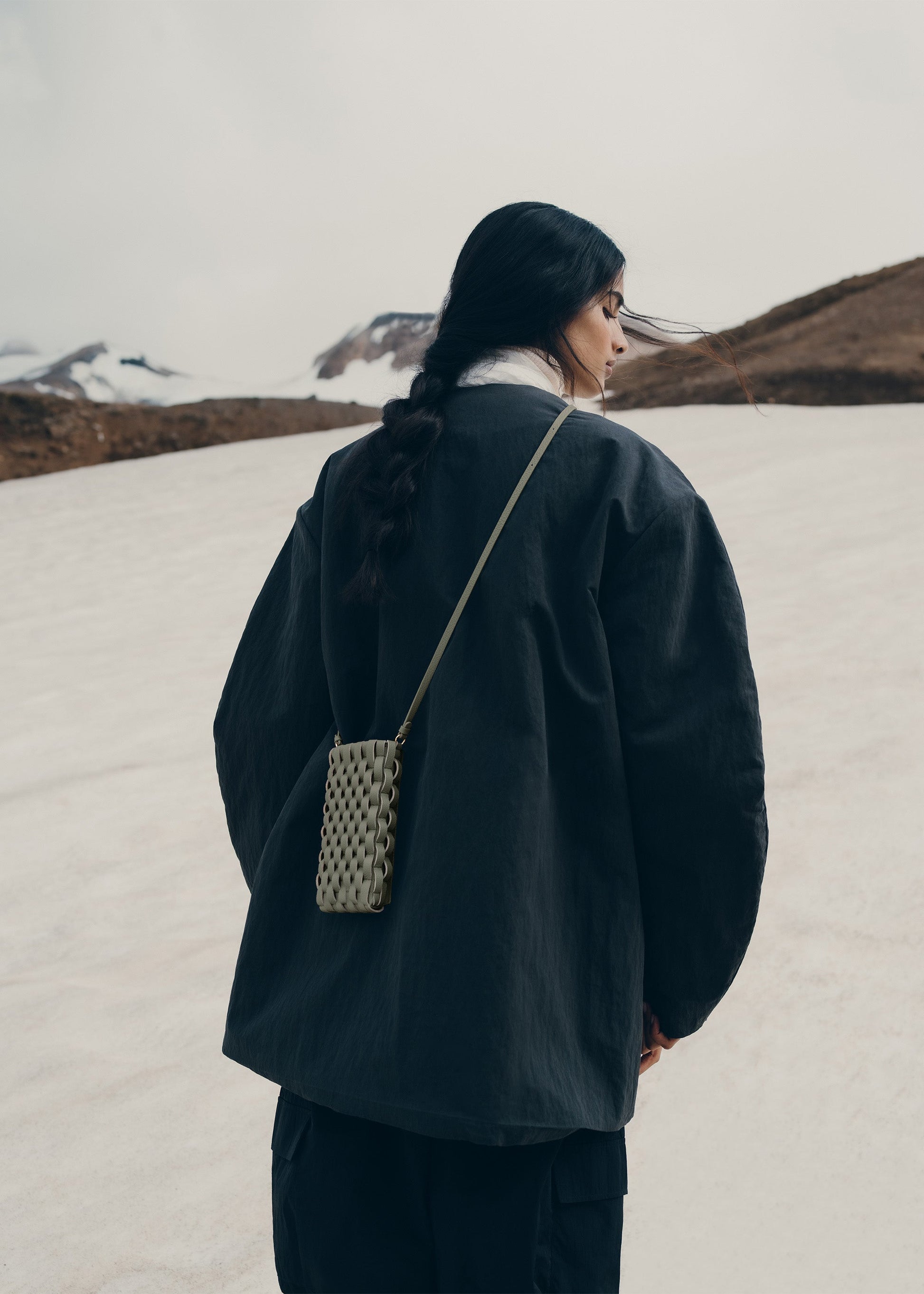 The Onda phone case is shaped by woven strips to form a wave-like leather relief texture on the exterior. Worn crossbody or around the neck, this accessory can also be used as a card holder.